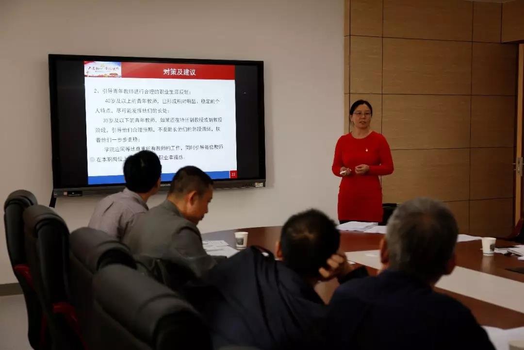 青年教师发展状态报告与对策研究”调研课题,从选题原因、基本现状、调查方式、问题成因、解决对策等方面进行了具体汇报。她表示青年教师是学院办学的骨干力量,要多方面进行引导,进一步激发活力和创造力,帮助青年教师更好的成就事业。学院党委副书记余江涛就“韦德体育官网