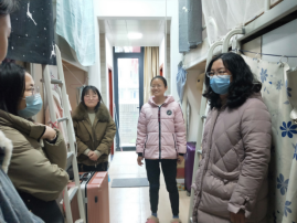 党委书记黄菊、党委副书记余江涛、副院长周炜和学工组全体辅导员老师分组深入到学生寝室,看望慰问春季开学返校的学生。