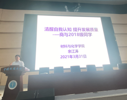 党委副书记余江涛结合国家与世界发展的形势,行业企业发展的态势,高等教育发展的大势,就业发展的趋势等,指出形势容不得我们懈怠;希望同学们能从过去取得的成果和已有的积累中科学评估自我状态,发展新优势,打造新舞台;另外,他还指出一些影响调适的变量,如“跟风随大流”“个性优柔寡断”等,并依次给出解决方法,为同学们指明当前的学习方向。最后,余书记通过引用习近平总书记的经典语录“历史只会眷顾坚定者,奋进者,搏击者,而不会等待犹豫者,懈怠者,畏难者”。祝愿同学们都能成为前者,在材化这条路上,走出自己的康庄大道。