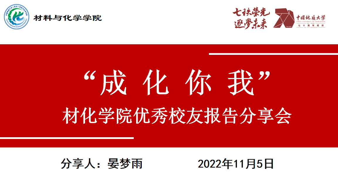 2012届优秀校友,武汉理工大学研究员、博士生导师、华盛顿创新学者、国家高层次青年人才晏梦雨研究员为同学们做分享,材料系主任梁玉军老师主持。