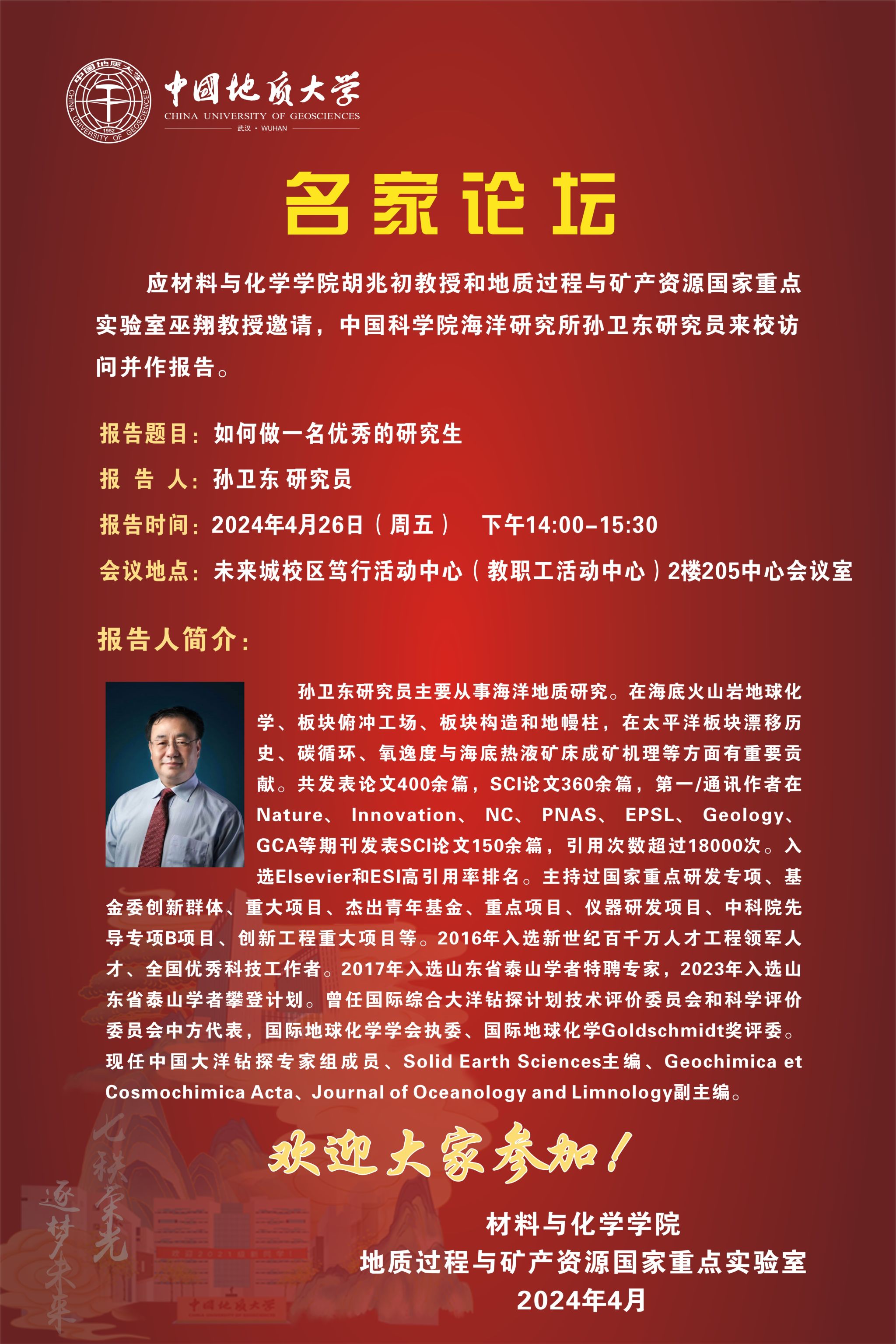 应韦德体育官网 及地质过程与矿产资源国家重点实验室邀请,国家自然科学二等奖、安徽省科学技术一等奖获得者,中科院海洋研究所孙卫东研究员将与韦德体育官网 师生交流并讲座。