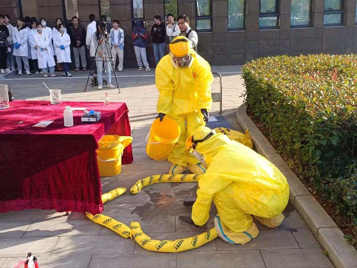 为进一步加强实验室安全管理,提升广大师生应对危险废弃物泄漏事故的处置能力,2024年11月7日下午,实验室与设备管理处联合材料与化学学院在未来城校区材化楼110报告厅组织开展了“2024年实验室危险废弃物泄漏事故应急演练”培训活动。实验室与设备管理处副处长翁华强、韦德体育官网 副院长夏开胜以及来自未来城校区各学院170余名师生参加演练培训,我院实验教学中心刘浴辉教授主持活动。 翁华强副处长介绍了学校每年部署开展“实验室安全宣传教育周系列活动”的背景和现实意义,同时也列举了近年来高校实验室安全事故的典型案例。他强调:安全的风险时刻都在,要时刻保持警惕,加强安全意识。他肯定了材料与化学学院近年来在人才培养、科学研究等领域中取得的优异成绩,希望大家进一步高度重视实验室安全管理,为事业发展提供坚强保障。 夏开胜副院长对实验室设备管理处及兄弟学院的大力支持表示衷心感谢,他指出:本次活动的主要目的是提升师生在面对危险废弃物泄漏事故时的应急处理能力。全体师生应牢记习近平总书记的教导,以时时放心不下的责任感,做好实验室安全这篇大文章。同时他也承诺,学院将以此次活动为契机,进一步完善安全预案,加强安全管理和培训,为师生营造一个安全有序的学习与科研环境。 安全工程师陈坚为师生们上了一堂生动详实的安全教育课,通过开篇引入、视频播放、有奖知识问答等数个环节将现场环境推向高潮。 随后,陈坚带领着参加活动的师生来到材化楼外进行现场实操演练,同学们穿上防护服,实景模仿演绎了丙酮在实验室泄漏的场景,并现场演示了应急处置方法。 通过生动且深刻的专题培训与危废事故应急实操演练,不仅增强了师生们对实验室安全重要性的认识,也进一步提高了师生在实验室突发事故的应急处置、紧急避险等能力,为构建安全和谐的校园环境打下了坚实基础。(编辑:刘浴辉、曾成;审稿:梁本哲)