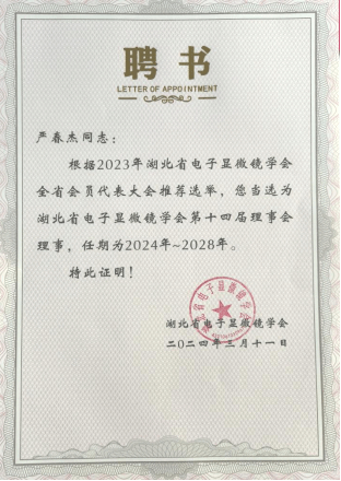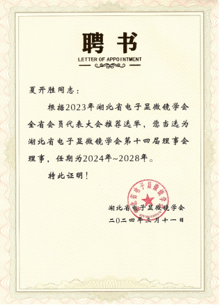 严春杰教授、夏开胜副院长作为新一届学会理事受邀参会,分析测试平台王洪权副主任也参加了本次盛会。会上,湖北省电子显微镜学会理事长赵东山向严春杰、夏开胜两位教授颁发了理事聘书。本次会议共有13位专家报告,夏开胜副院长在会上介绍了我校电镜类仪器设备建设情况,以及韦德体育官网