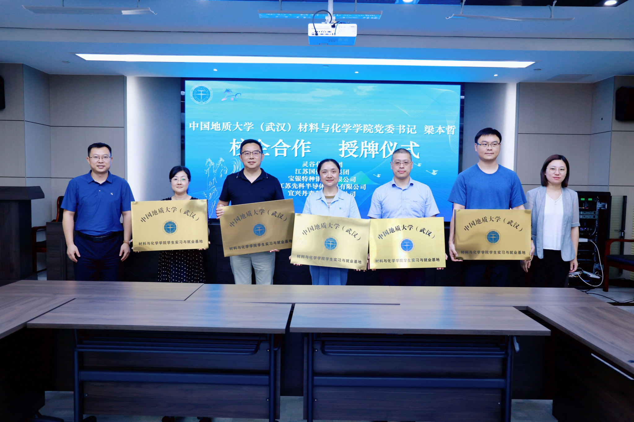 梁本哲为经开区重点企业灵谷化工集团、江苏国信协联集团、宝银特种钢管有限公司、江苏先科半导体材料有限公司、宜兴丹森科技有限公司颁授学生实习与就业基地铭牌。