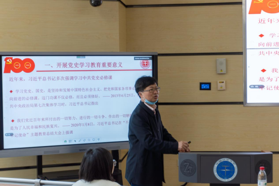 学生党史学习教育暨庆祝建党100周年活动方案》。他从党史学习教育的重要意义、学校对党史学习教育的部署安排和学院的执行方案三个方面做了详细的讲解。他希望广大学生和党员干部要充分认识到开展党史学习教育的重要意义,理解习近平总书记关于党史学习教育的重要讲话精神,认识到学习党史、国史是坚持和发展中国特色社会主义,把党和国家各项事业继续推向前进的必修课,这门功课不仅是必修,而且必须修好。他对学校《中共中国地质大学(武汉)委员会印发<关于深入推进党史学习教育 开展庆祝中国共产党成立100周年系列活动的实施方案>的通知》和《中国地质大学(武汉)学生工作处(部)关于在全校学生中深入开展庆祝建党100周年和党史学习教育的实施方案》进行了详细的介绍。并从“党史论著‘精学’、主题活动‘导学’、理论宣讲‘助学’、党史知识竞赛‘促学’、红色文艺‘辅学’、实践服务‘励学’、骨干典型‘引学’”七个方面介绍了学院党史学习教育活动方案,并鼓励同学们在学中做,在做中学,以学促进,知行合一,做到“学党史、悟思想、办实事、开新局”。