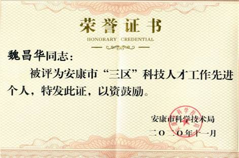 魏昌华被评为安康市“三区”科技人才工作先进个人