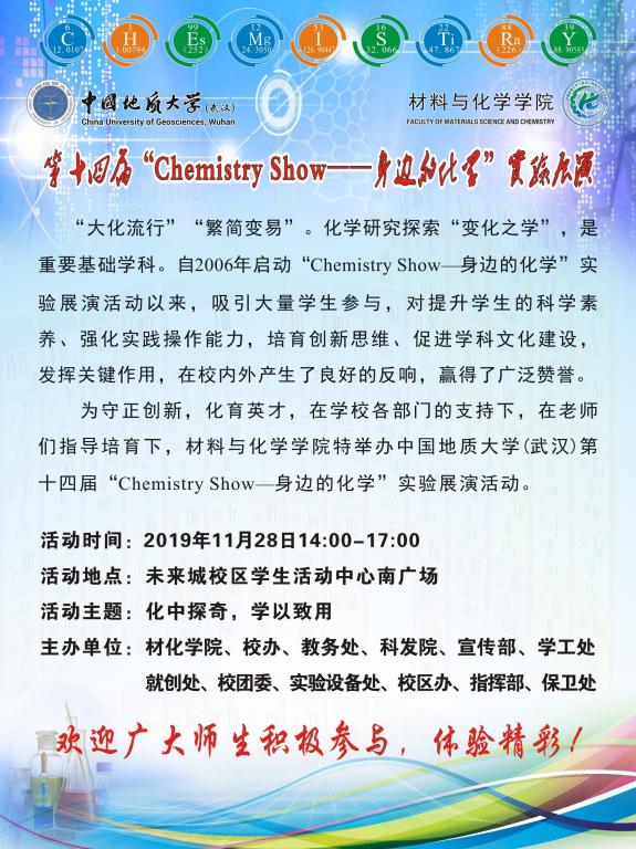 特举办中国地质大学(武汉)第十四届“Chemistry Show—身边的化学”实验展演活动。