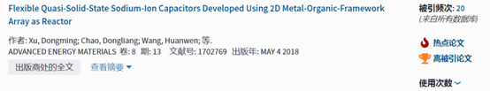 王欢文教授2018年发表在《先进能源材料》(影响因子:21.875)上的研究论文《基于二维金属有机框架作的柔性准固态钠离子电容器》(中国地质大学(武汉)为第一通讯单位)入选ESI全球TOP0.1%热点论文(Hot Papers)。