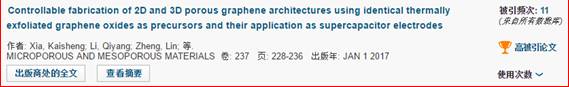 夏开胜副教授(第一作者)、周成冈教授(通讯作者)等2017年在国际分子筛协会官方期刊《Microporous and Mesoporous Materials》上发表的学术论文“Controllable fabrication of 2D and 3D porous graphene architectures using identical thermally exfoliated graphene oxides as precursors and their application as supercapacitor electrodes”于2018年1月入选ESI全球高被引论文(前1%),中国地质大学(武汉)韦德体育官网