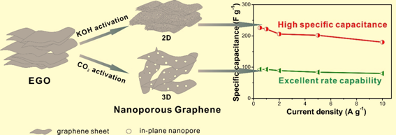 石墨烯是超级电容器、锂离子电池等电化学储能研究领域的明星材料,如何基于石墨烯构建有效的孔道结构以提升其储能密度是当前面临的难题。该论文工作发展了一种高效、可控、易规模化的多孔石墨烯制备方法,可以极大提高石墨烯材料的比表面积和孔隙率,从而显著提升了此类材料作为超级电容器电极的能量密度和功率密度。所制备的二维多孔石墨烯具有高达2518m2g-1的比表面积,拥有高达261Fg-1的比容量;三维多孔石墨烯具有高达3.08 cm3g-1的孔体积,高倍率条件下容量保有率高达86%。上述研究成果对多孔石墨烯的可控制备及超级电容器电极材料的设计具有重要的指导意义。