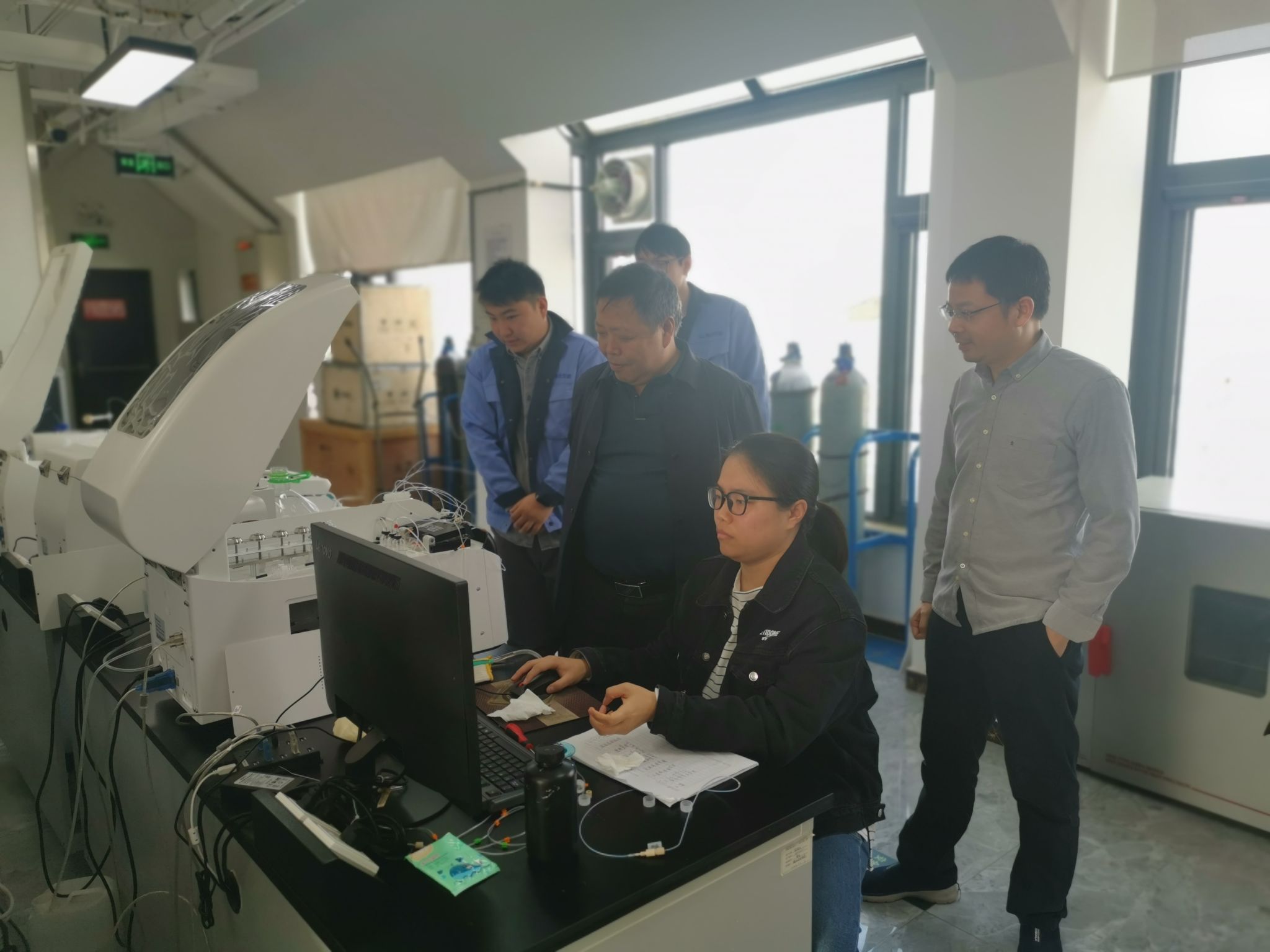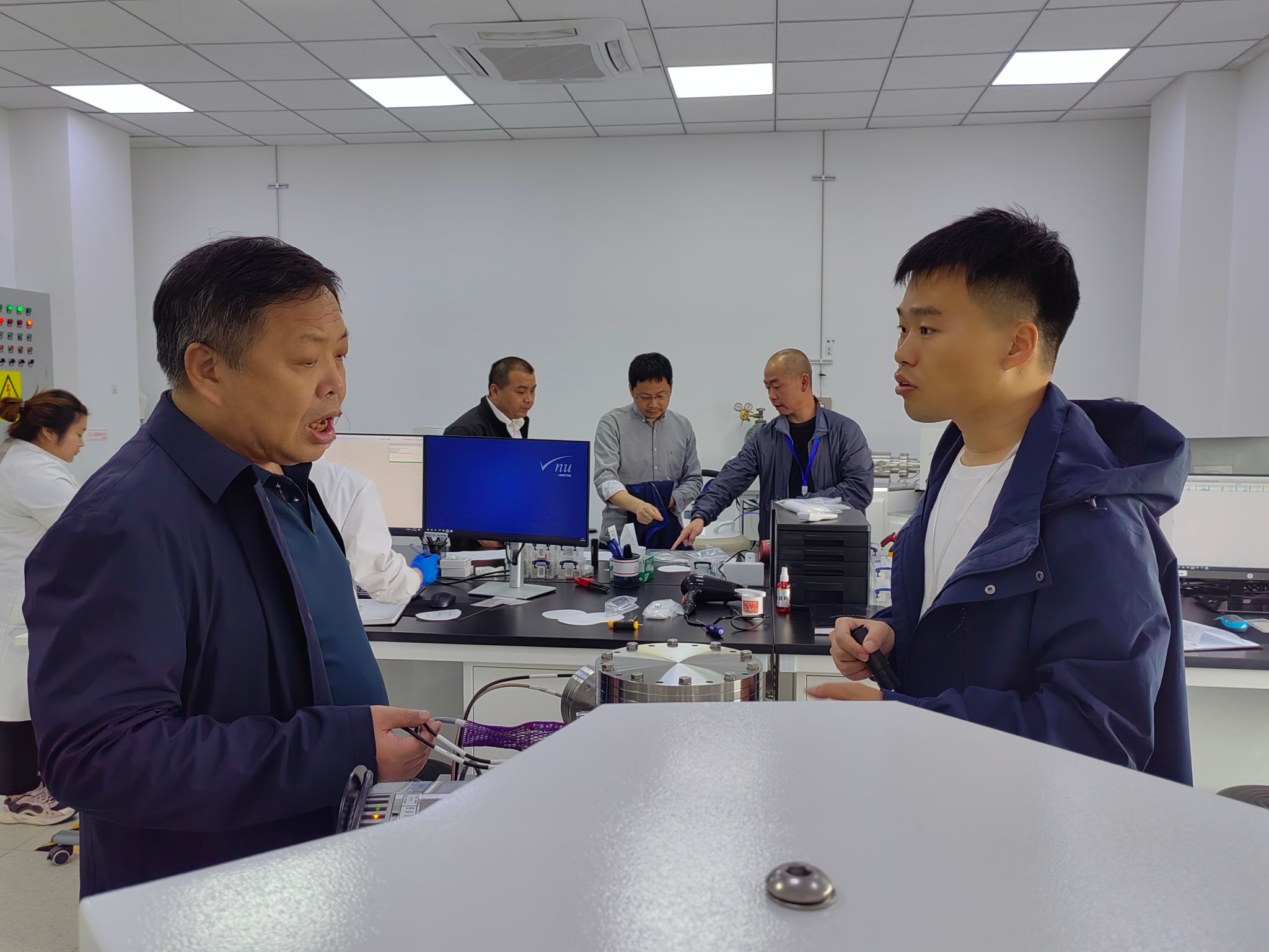 11月1日下午,胡院长一行来到北京市顺义区天竺空港工业区的北京清质分析技术有限公司。总经理张辉健对该司在新能源及高纯材料检测业务发展及分析仪器联合研发等情况的介绍。据他称,该公司成立于2019年,专注于新能源及高纯材料原位杂质检测的高科技企业,是该领域同时通过中国合格评定认可委员会(CNAS认证)和中国计量认证(CMA)的第三方检测中心(国内仅三家),拥有多台辉光放电质谱仪(GD-SF-MS)、电感耦合等离子体磁质谱仪(ICP-SF-MS)、电感耦合等离子体光谱仪(ICP-OES)以及专业级样品处理间等。恰逢该司与厦门大学共同研发的独特的辉光放电时间飞行质谱仪(GD-TOF-MS)的安装调试过程,胡兆初与工程师们详细地探讨了该仪器的工作原理及独特的离子传输及检测单元,并介绍了地质分析团队所开发的激光固体采样微区分析技术,双方就未来共同开展矿物样品及新材料固体直接分析及标准物质研发、人才培养等方面进行了深入地沟通。