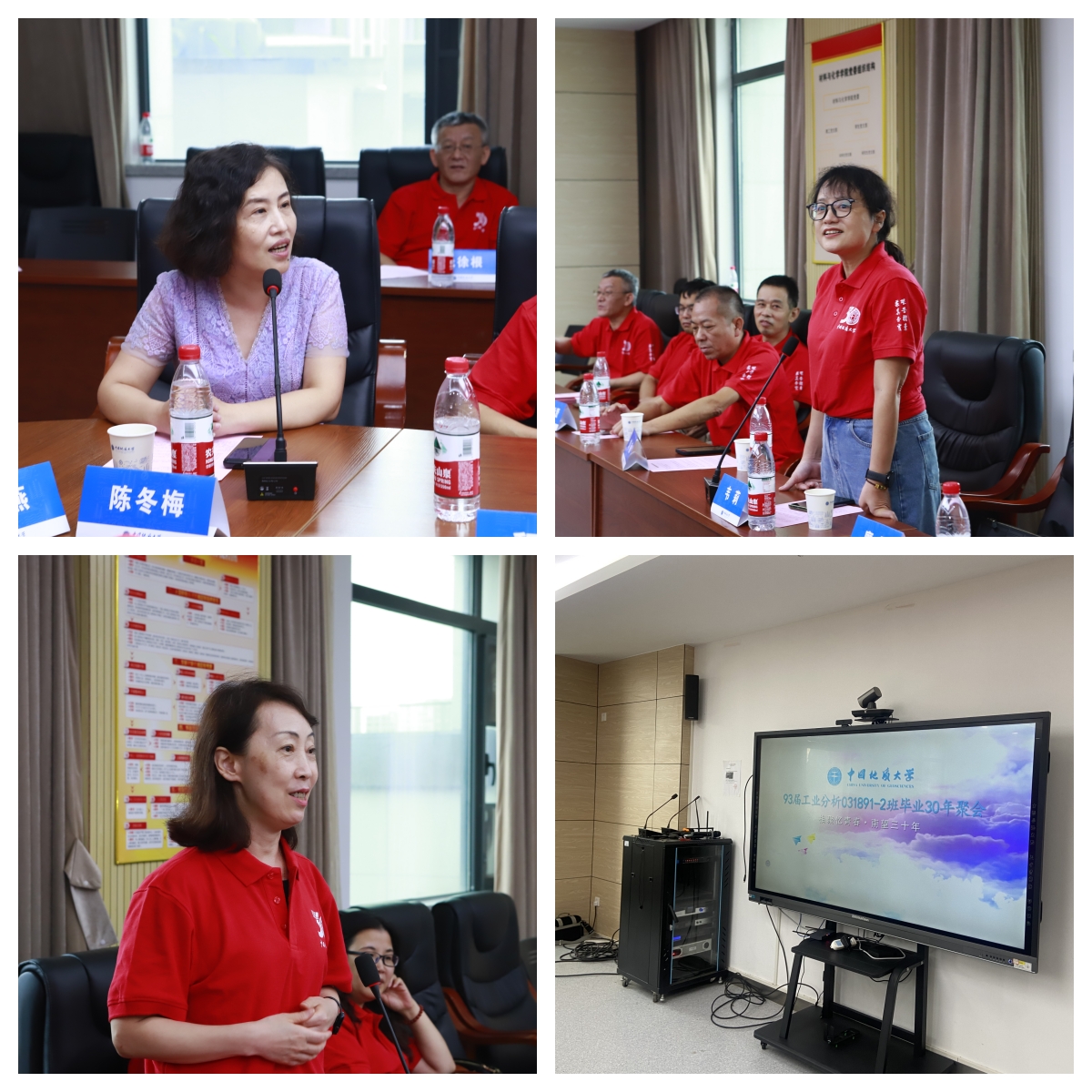 校友代表031891班古文炳、031892班傅卫东代表各自班级向学院表达感谢和敬意,回忆三十四年前在地大材化相遇相伴的日子,并汇报了毕业三十年以来班级同学在各自领域取得的成果,希望学院和校友都能在未来继续奋勇争先,为祖国发展贡献更多材化力量。