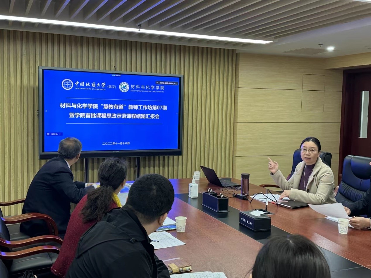 学院首批13门示范课程负责人就本课程开展课程思政建设情况、特色与创新、评价与成效、下一步的建设计划等进行了汇报。报告会亮点纷呈:赵凌的《晶体学》课挖掘校本特色思政元素,讲述地大矿物结晶学创派宗师彭志忠先生赤诚报国的故事;韩波的《结构化学》课结合课程内容引入辩证唯物主义的世界观和方法论、科学思维等;公衍生的《材料工程伦理》课构建了材料工程伦理案例库;陈婷的《有机化学》课探索“一中心、二渠道、三融合、四步走”的课程思政模式;严春杰的《矿物材料工艺学》课完成了分章节“课程思政教学设计关系对应表”,形成了完整体系;程国娥的《无机化学A》课作为应用化学专业第一门专业基础课重点培养学生的专业情感激发家国情怀和责任担当;孙剑的《半导体材料与技术》课在全英文教学中探索了课程思政建设的新方法;马睿的《高分子物理A》课采用查找资料、小组讨论、汇报展示、撰写报告等方式让学生在“翻转课堂”中感悟体验;李勇的《大学化学B》课探索了“定、挖、选、思、教、评“六位一体的建设方案;洪建和的《物理化学A》课深挖学科发展史中的育人元素培育科学精神;谭劲的《材料学导论》课将专业知识、国家战略、学科特色结合引导学生立大志立长志;贺贝贝的《化工原理》课从学情研究出发探索思政元素的引入和课程思政实施原则;周炜的《材料物理》课不仅在课堂教学,而且在MOOC建设和教材修编中融入课程思政元素和思想。